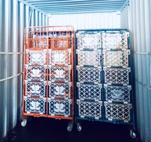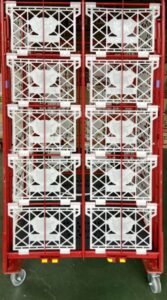 カゴ台車や滑りやすいタイヤ付き荷役台。