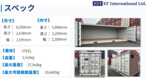 サイドオープンコンテナの特徴・メリット 通常のリアドアに加え、側面が開口するコンテナです。 また、コンテナ内の保管物が庫外からの水漏れにより破損した経験をお持ちの方もいらっしゃるのではないでしょうか。 EFインターナシ […]